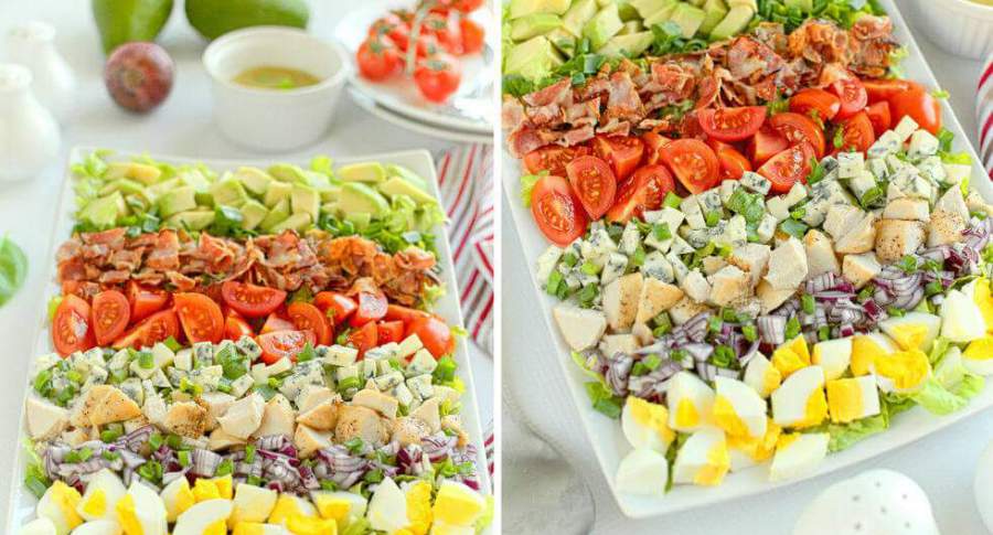 8. Салат Кобб перед подачей (не ранее!) полейте подготовленным соусом. С первого взгляда может показаться, что компоненты салата уложены в беспорядке. Но последовательность рядов очень хорошо продумана, каждый компонент в салате необходим, а соседство компонентов отлично сочетается. Салат Кобб может стать сытным ужином, блюдом на пикник или на работу.