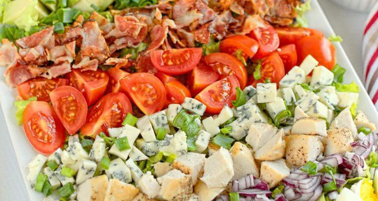 7. На большом блюде или в салатнике на дно уложите измельченный салат. Поверх салата укладывайте последовательно в ряды отдельные нарезанные компоненты – авокадо, бекон, помидоры, сыр, курятина, красный лук, вареные яйца. Сверху посыпьте мелко нарезанным зеленым луком.