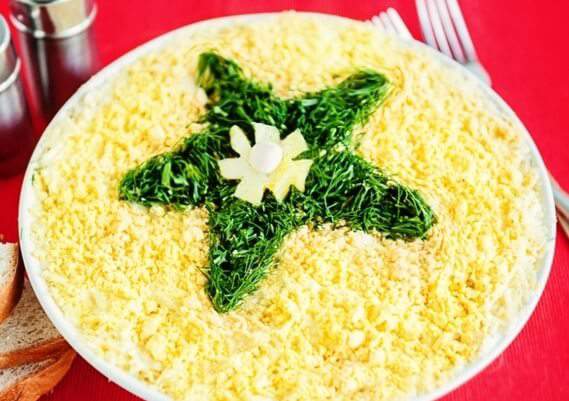 7. И в заключение натрите яичные желтки на мелкой терке и посыпьте ими салат сверху. Из мелко нарезанной зелени укропа насыпьте сверху салата звездочку, в центре которой водрузите цветок из вареного яйца.