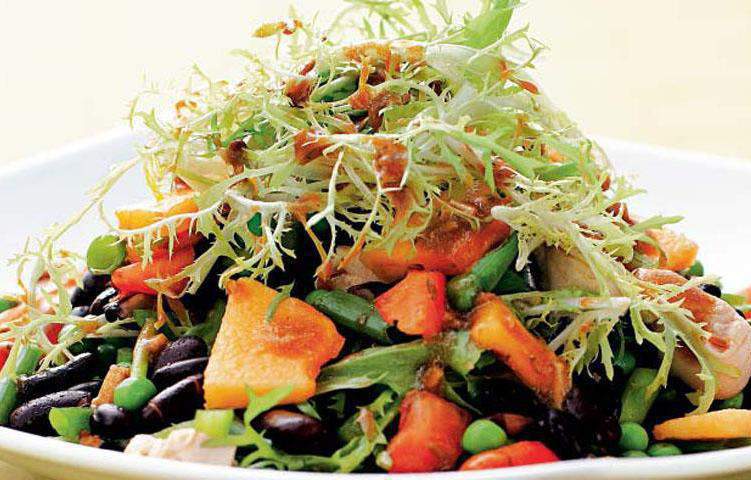 8. Смешайте в большой миске дыню, зеленый лук, помидоры, индейку, фасоль и горошек. Полейте салат с индейкой и черной фасолью заправкой и перемешайте. Подавайте салат, выложив его на салатные листья.