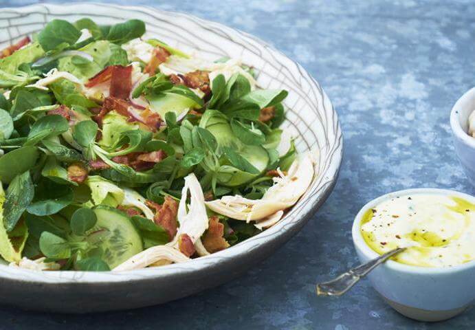 7. Полейте салат заправкой и перемешайте, сверху выложите кусочки подсоленного бекона. Подавайте готовый салат с курицей, беконом и цикорием немедленно.