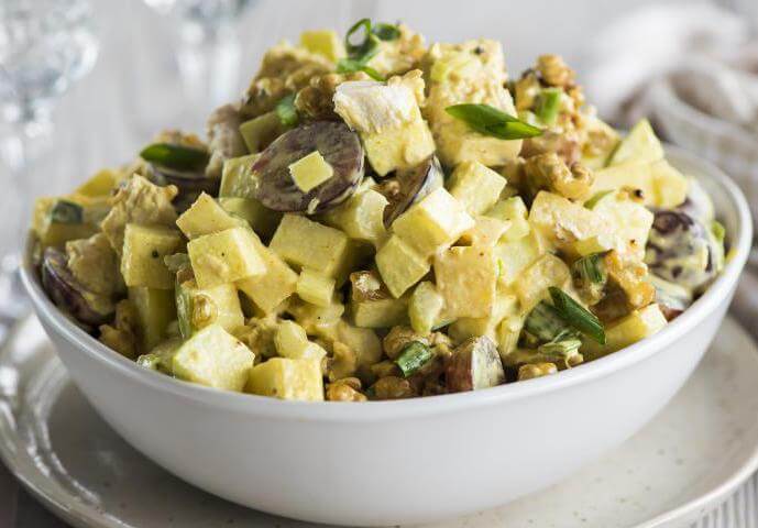 7. Оставьте салат т с курицей и фруктами на полчаса в холодильнике, а перед подачей посыпьте поджаренными грецкими орехами.