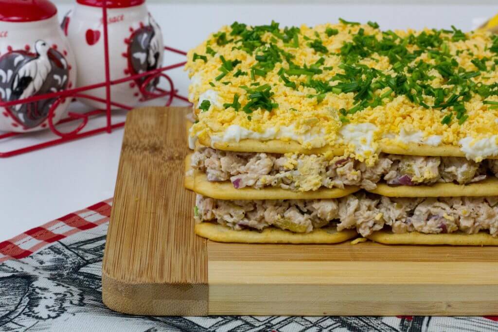Салаты на крекерах приобретают все большую популярность. Такие салаты функционально схожи с тортом, на слои крекеров выкладывается начинка, которая может быть сладкой или закусочной, соленой. Предлагаем вашему вниманию интересный рецепт салата с курицей и овощами на крекерах для будней и праздников.