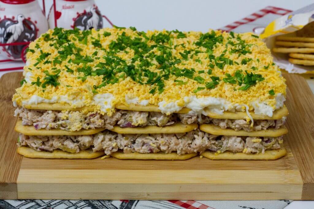5.На разделочной доске или сервировочном блюде уложите 9 крекеров плотно друг к другу, распределите по ним половину мясной массы. Затем сверху выложите еще 9 крекеров, и на них – оставшуюся мясную массу.
