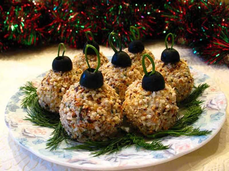6. Сложите шары на блюдо, из половинок оливок приставьте «ушки» и вденьте в них «веревочки» из зелени. Блюдо вокруг шаров также украсьте зеленью.
