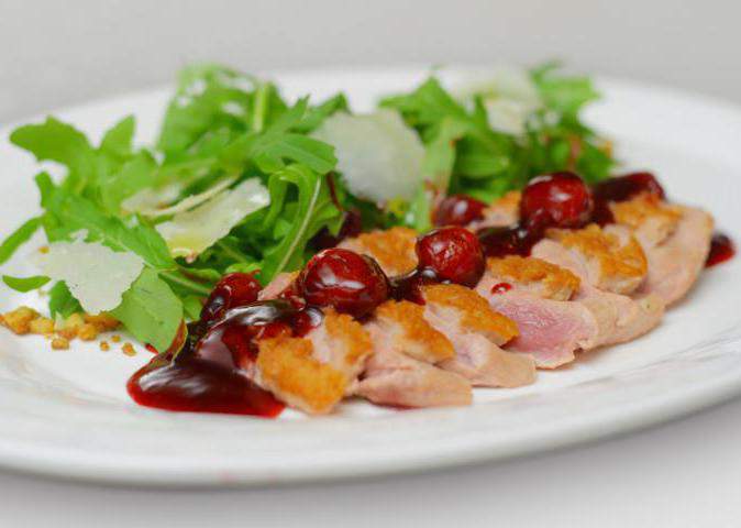 7. Нарежьте утиную грудку ломтиками выложите на блюдо и полейте соусом. Сверху на мясо выложите вишню и посыпьте карамелизованными орехами. Теплый салат с уткой под вишневым соусом готов к употреблению.