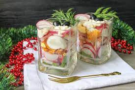 Весенний салат-коктейль с копченой курицей, редисом и яйцом не содержит витиеватых ингредиентов, но гости останутся довольными благодаря необычной подаче вкусного блюда в стаканах. Все составные продукты в салате подобраны по вкусу. Но вы можете дополнить его тем, что привыкли видеть в блюдах и закусках (например, консервированной фасолью или кукурузой). Выложив сверху на салат майонез, не перемешивайте его, чтобы блюдо не потеряло эффектный вид.