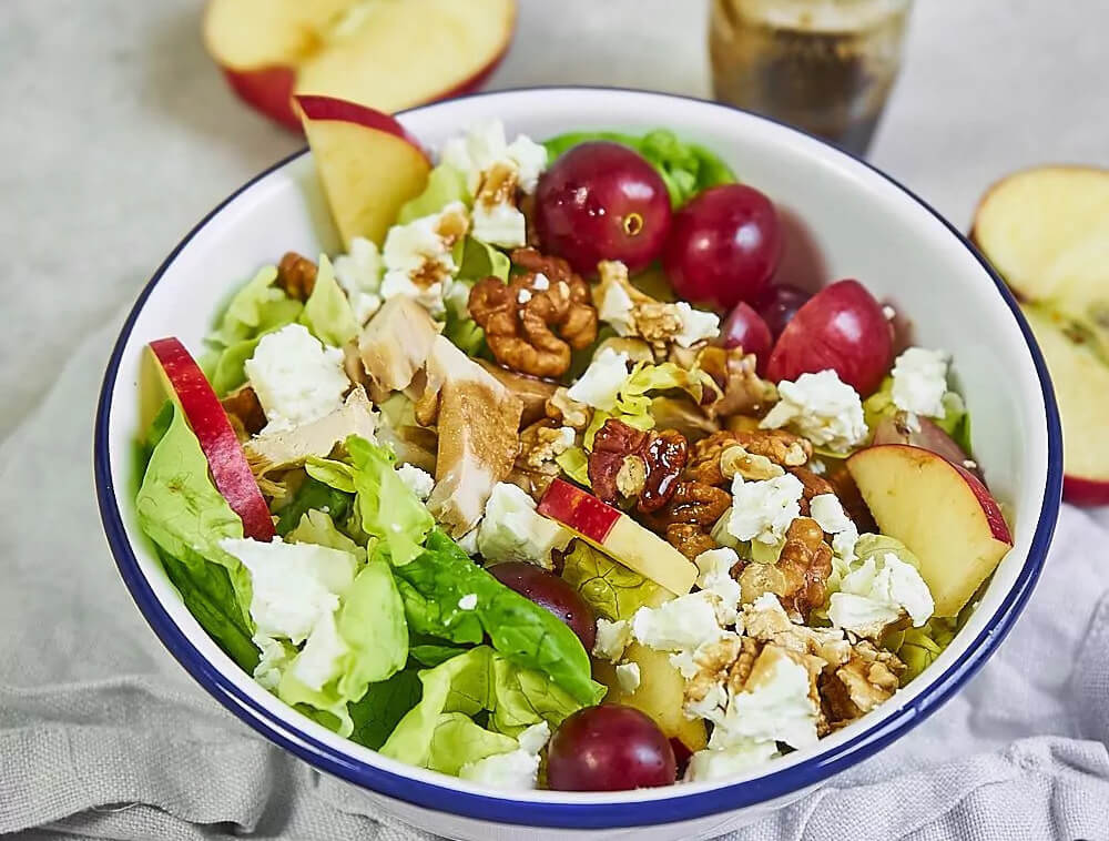 Вкусный салат с курицей, яблоками и орехами можно считать осенним салатом, так как в список ингредиентов кроме сыра фета входит виноград. Но гроздья позднего винограда еще долго можно увидеть и зимой на прилавках магазинов, поэтому в это время есть возможность обогатить домашнее меню осенними ароматами, красками и вкусами. Салат подходит для домашней трапезы, и гости за праздничным столом будут от него в восторге.