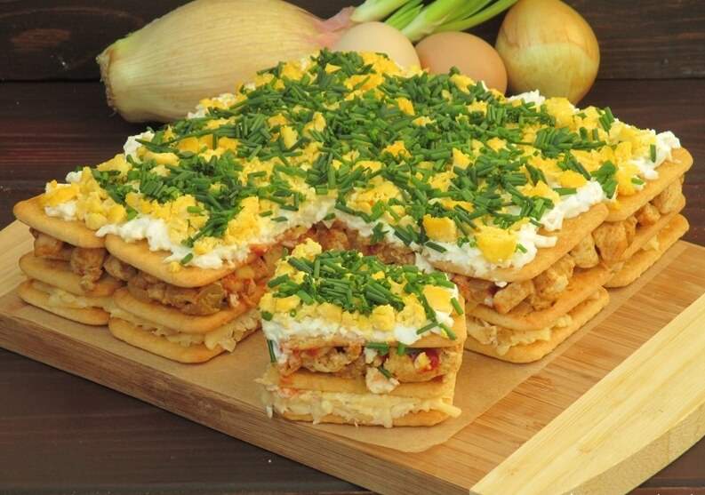 Предлагаем вам рецепт сытного и вкусного салата с курицей на крекерах, который имеет праздничное оформление и очень красиво выглядит. А приготовить такой салат совсем не сложно из доступных продуктов. Благодаря оригинальной подаче на слоях печенья, простой салат превращается в изысканное угощение.