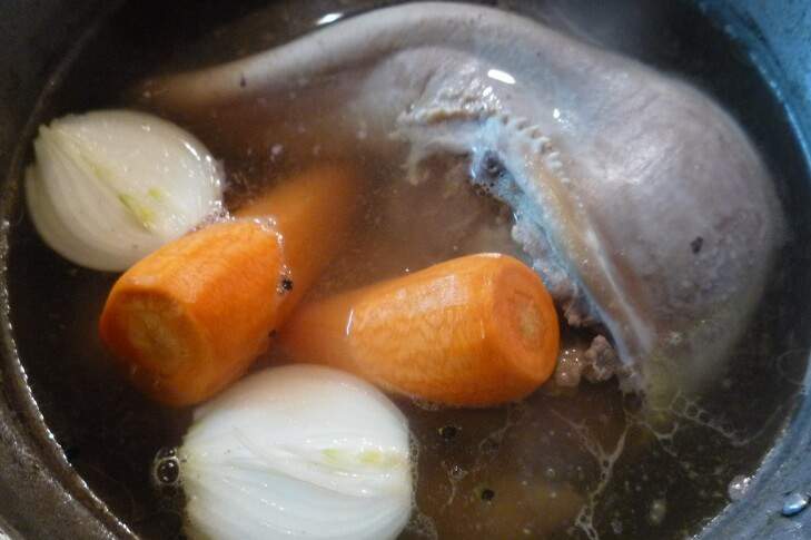 Залейте язык новой водой и отварите до готовности без соли (солить лучше в готовом виде), добавив в воду для варки очищенный лук, корнеплоды моркови и сельдерея. За полчаса до готовности можете добавить лавровый лист.