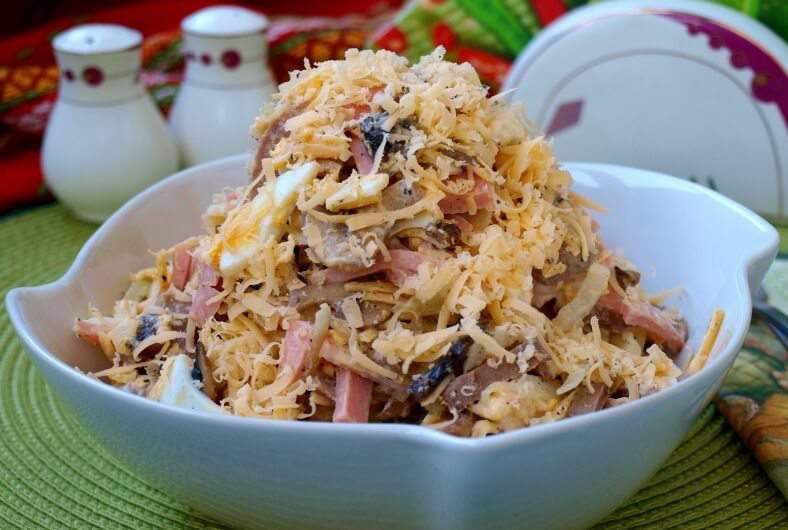 Язык считается деликатесным продуктом и блюда из него украсят самое изысканное застолье. Предлагаем вашему вниманию замечательный рецепт вкусного и сытного праздничного салата с языком. Пикантный салат состоит из многих ингредиентов, но основу его составляют свиной или говяжий язык, грибы и ветчина.