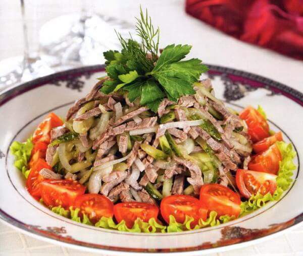 Салат из говяжьего языка с овощами и сыром легко усваивается, его можно отнести к категории диетических блюд. Язык в сочетании с овощами превращается в аппетитное изысканное блюдо, сыр придает ему ощущение сытности, а заправка на оливковом масле с соевым соусом и имбирной приправой будет пикантным восточным штрихом этой вкусовой идиллии.
