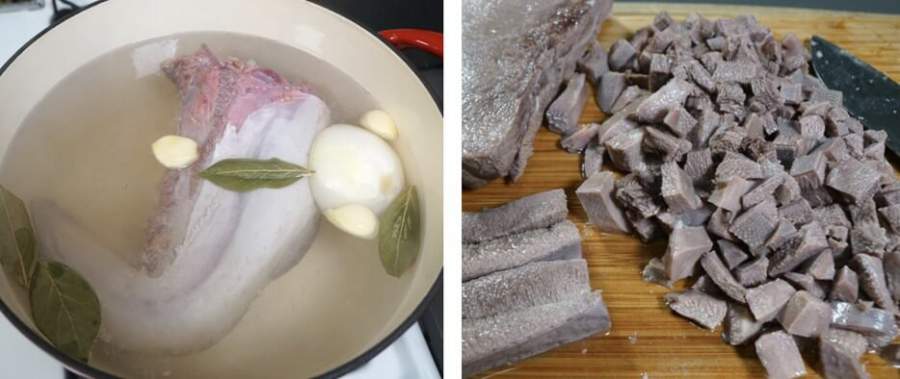 1. Телячий язык желательно приготовить заблаговременно. Отварите субпродукт, дайте ему немного остыть, а затем нарежьте в виде тонких полосок и оставьте, чтобы он остыл окончательно.