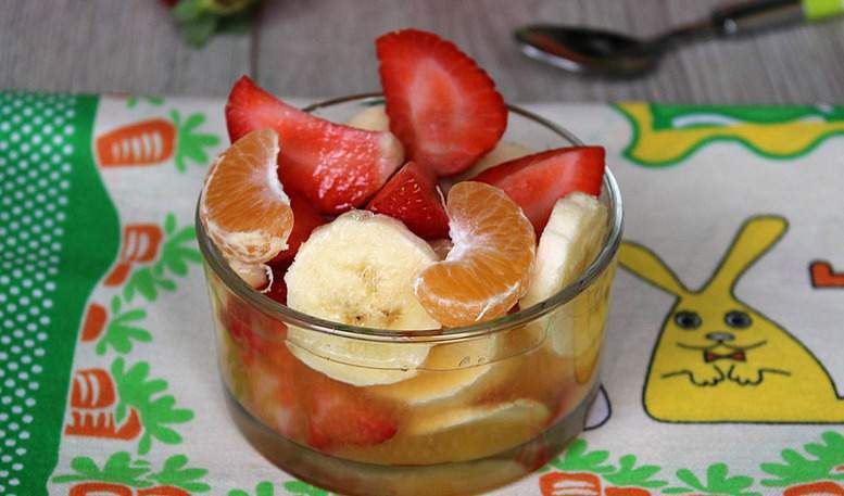 8. Детский фруктово-ягодный салат с медом готов. Переложите его в креманку или салатник и дайте ребенку насладиться. В салат могут быть включены и другие фрукты и ягоды.