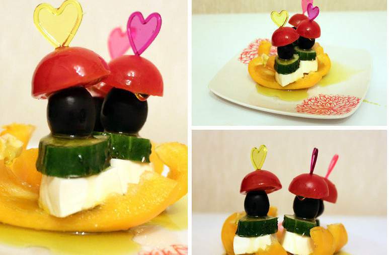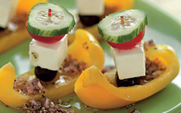 4. Оденьте на шпажки по кружку огурца, по половинке помидорчика черри срезом вверх, по кубику брынзы и по маслине.