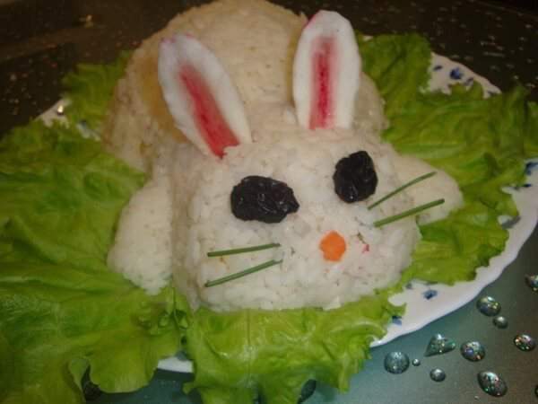 5. Весь салат с очертаниями зайчика покройте отваренным заранее рисом. Вырежьте из листьев капусты два ушка, закрасьте середину их свекольным соком и воткните в голову. Добавьте носик из моркови, глаза из чернослива или маслин, усики из перышек зеленого лука.