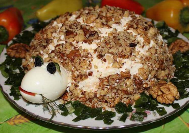 6. Детский салат «Черепаха» с курицей, яблоками и грецкими орехами готов к восхищенному приему гостей.