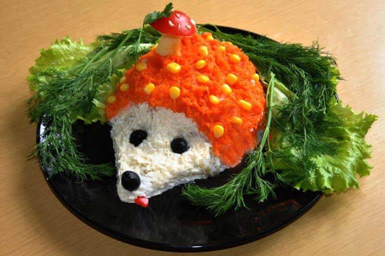 7. Детский салат из печени «Ёжик» готов. Подавайте его к праздничному столу под восторженные возгласы малышей и взрослых.