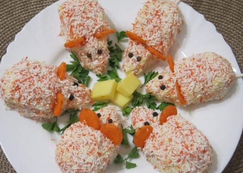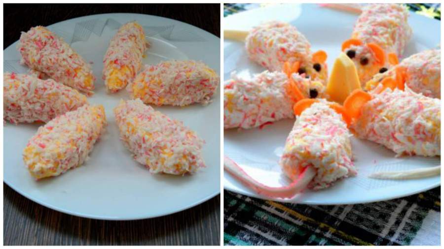 4. Обваляйте туловища мышек в тертых крабовых палочках и уложите на плоское блюдо по кругу (мордочками к центру). Из моркови, отваренной аль денте, нарежьте кружки и вставьте их мышкам в качестве ушек. Глаза сделайте из горошин перца, хвосты – из тонко нарезанной крабовой палочки.