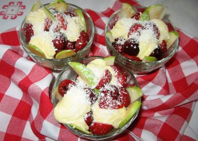 5. В небольшие порционные креманки или пиалы уложите нарезанные яблоки, клубнику и черешню, переслаивая фрукты и ягоды взбитыми сливками.