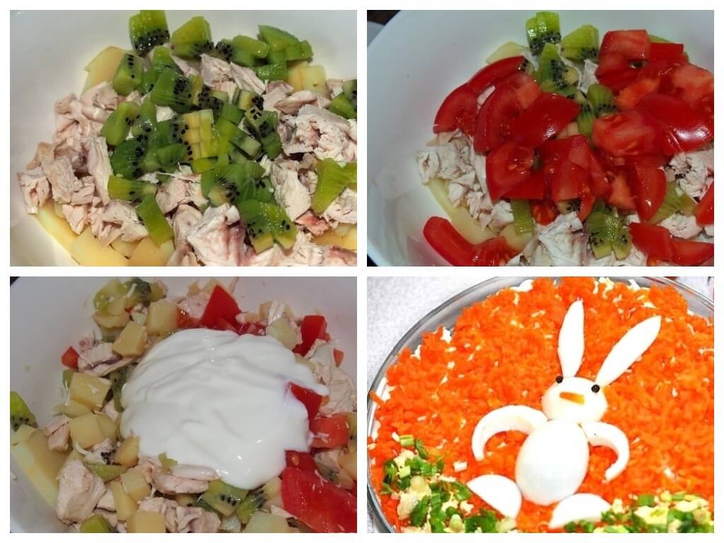 8.Салат для детского праздника готов. Можете сразу подавать его к столу или дать настояться в холодильнике около 1 часа. Как вариант, можете разложить и оформить салат сразу в порционные тарелки, тогда каждый малыш получит по зайчику.