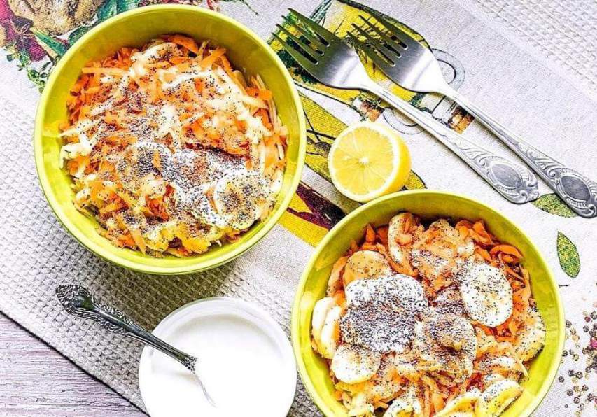 4. Измельченную морковь, яблоко и банан сложите в салатник удобного размера, заправьте сметаной по вкусу, посыпьте маком или корицей. Как вариант, можете посыпать тем и другим.