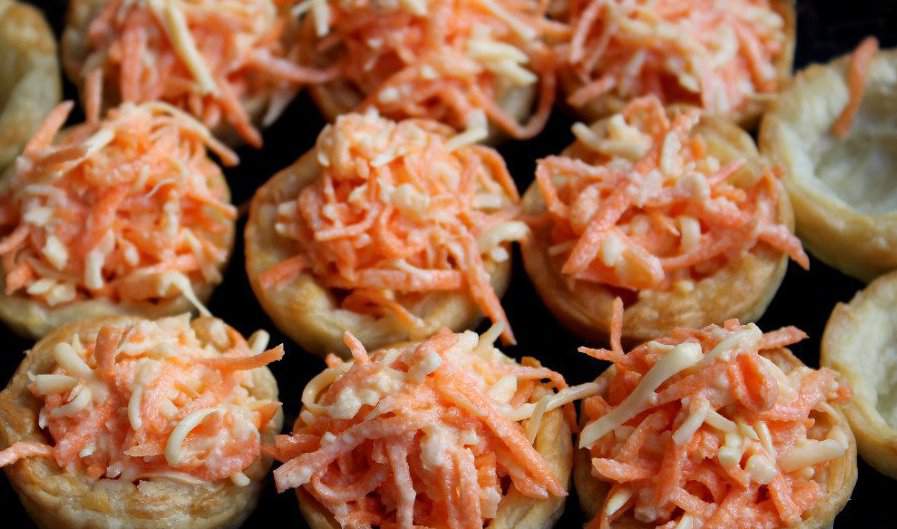7. Морковный салат в тарталетках готов к подаче на стол. Можете украсить его перед подачей любой зеленью.