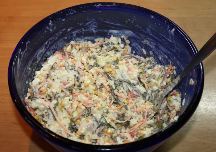 4.Морскую капусту откиньте на дуршлаг, промойте под холодной водой, дайте стечь жидкости и переложите в миску. Добавьте туда же остывший рис, измельченные яйца, крабовые палочки, морковь, кукурузу, лук.