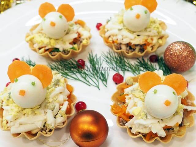 Если, составляя праздничное меню к Новому году Белой Крысы, трудно решиться, что готовить – традиционную «Мимозу», салат в тарталетках или забавную закуску, украшенную яичными крысятами, почему бы не совместить эти три желания воедино. Приготовьте вкусный салат «Крысята» на «Мимозе» в тарталетках.