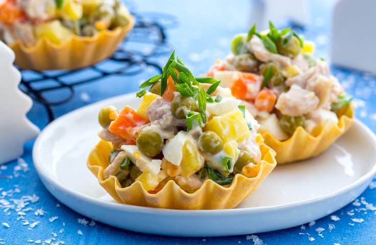 6. Разложите на блюде тарталетки и наполните их салатом. Сверху по желанию, можете украсить салат листиками любимой зелени.