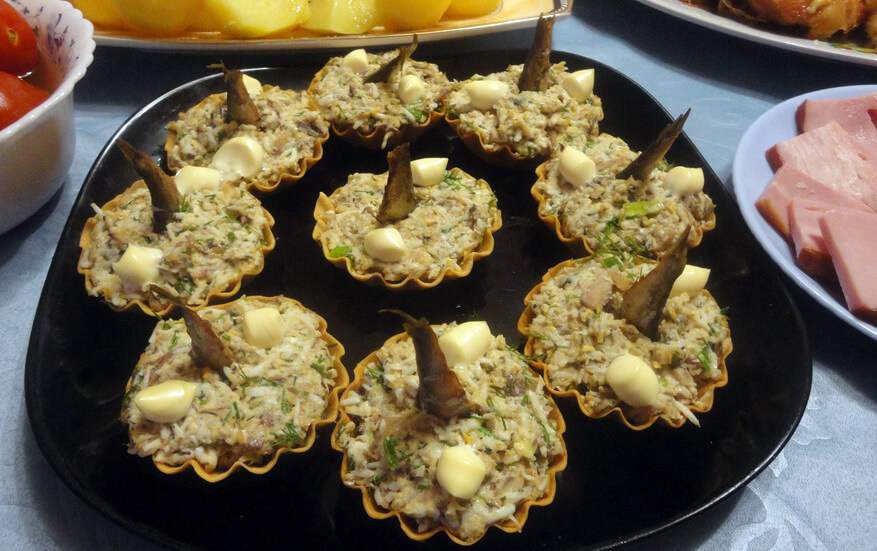 5.Перед самой подачей наполните тарталетки шпротным салатом с горкой. В каждую тарталетку воткните рыбку (хвостиком вверх). Капните немного майонеза для вкуса и красоты.