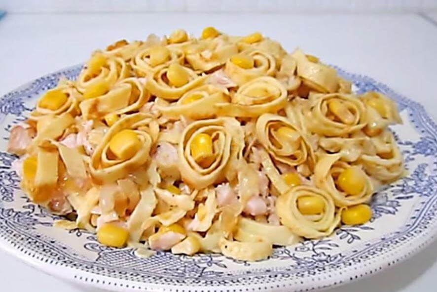 7. Выложите приготовленный салат на блюдо в виде горки. Украсьте блинными спиральками и оставленными зернышками кукурузы.