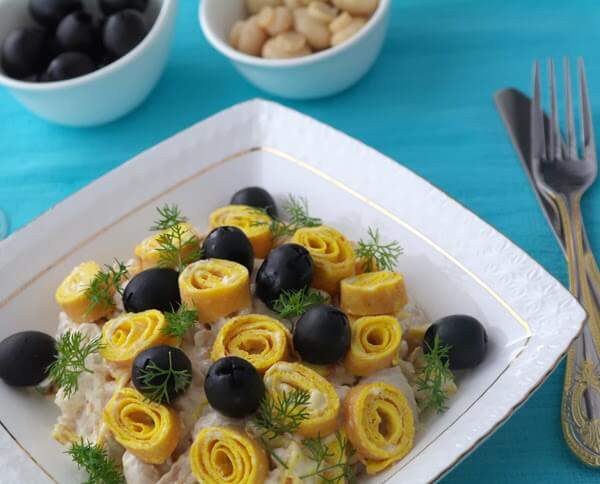 7.На основном салате разложите сверху нарезанные блинные рулетики вперемешку с черными оливками. Готовый салат с яичными блинчиками подавайте к столу, украсив веточками укропа.