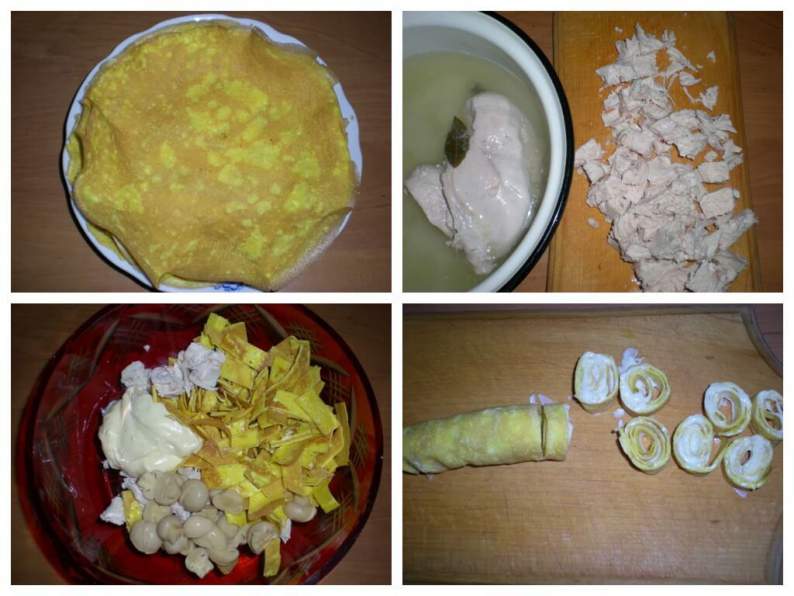 5.4 блинчика нарежьте полосками. Один оставшийся блин смажьте майонезом (примерно 1 ст. ложка), сверните в рулет и нарежьте небольшими кружочками.
