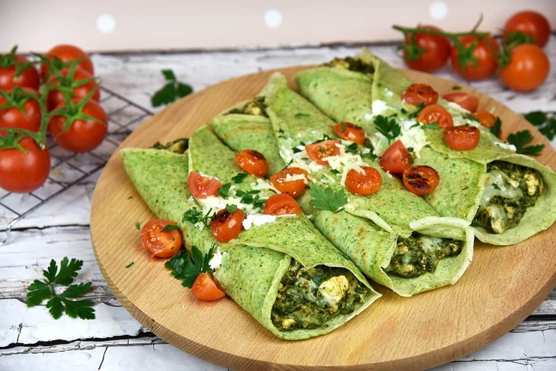 Зеленый цвет блинов получается в результате добавления в тесто мелко нарезанного шпината в качестве натурального красителя. Зеленая шпинатная начинка аппетитно дополняется курятиной, луком, чесноком и сыром фета и моцарелла для связки. Слегка поджаренные помидорки черри на основной зелени выглядят яркой вспышкой цвета и вкуса.
