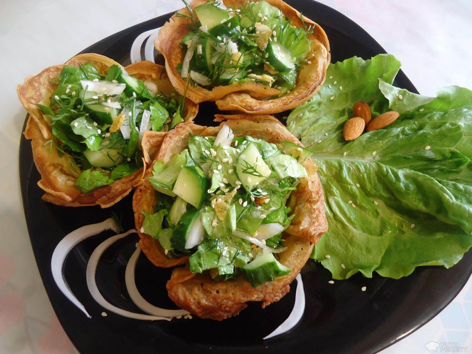 7.Зеленый салат в чашечках из блинов готов. Такой оригинальный порционный способ подачи придаст салату изысканный шарм, приятно удивит новизной вкуса и внешнего восприятия.