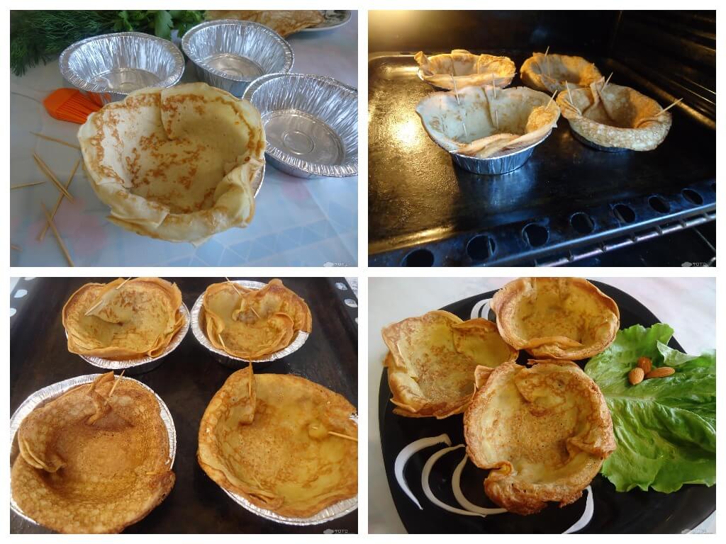 1.Небольшие жаропрочные формочки подходящего размера смажьте маслом, уложите в них блины, аккуратно скрепив образовавшиеся складки зубочистками. Постарайтесь не порвать блины и не порезать.