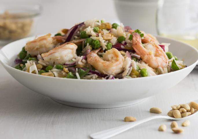 8. Выложите на пряный салат с рисом и креветками креветки, полейте оставшейся частью заправки и подавайте к столу.