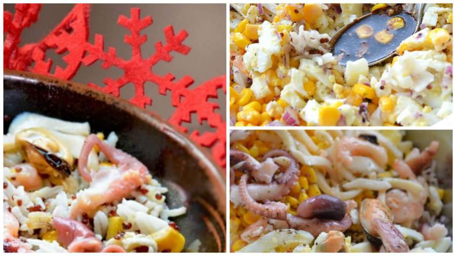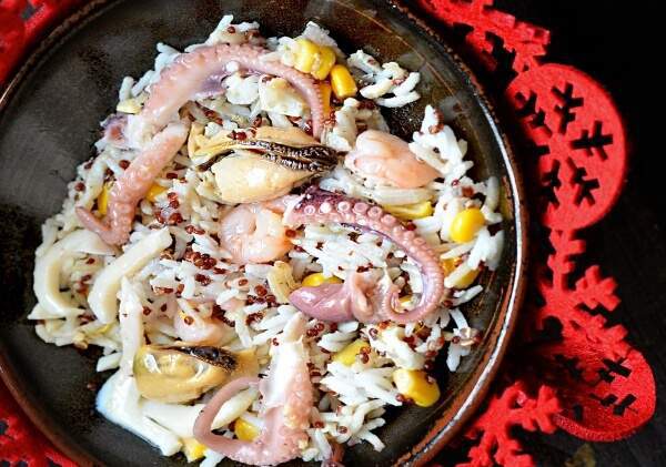 7. Полейте салат заправкой и хорошо перемешайте. Перед подачей оставьте рисовый салат с морепродуктами настояться полчаса в холодильнике.