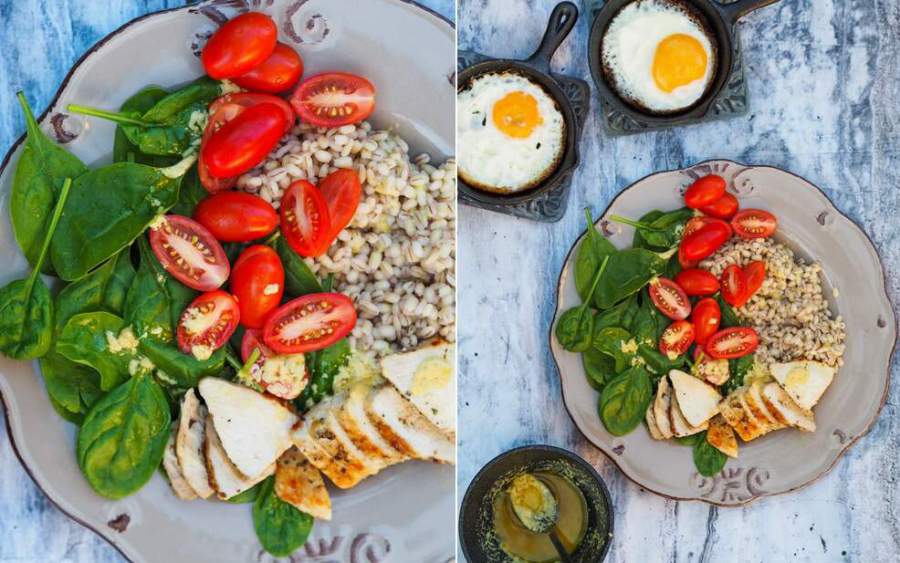 5. На блюдо уложите приготовленную перловую кашу, обжаренную курятину, нарезанную тонкими пластинками, листья шпината, нарезанные на половинки помидоры. Полейте соусом и подавайте немедленно с приготовленными любым способом яйцами.