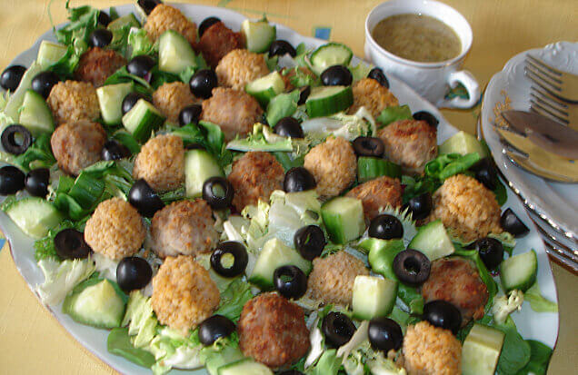 5.Из охлажденной каши сформируйте шарики, соизмеримые по размеру с мясными фрикадельками. На плоское овальное блюдо выложите вымытые и обсушенные листья салата. На зеленую подстилку разложите мясные фрикадельки и шарики из каши.