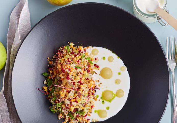 4. Выложите на тарелку кусу-кус, перемешанный с овощами, украсьте салат кинзой и микротравмами. На блюде сбоку от кус-куса выложите заправку для салата, а на нее выложите яблочное пюре. Салат с кус-кусом и хрустящими овощами готов к употреблению.
