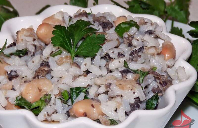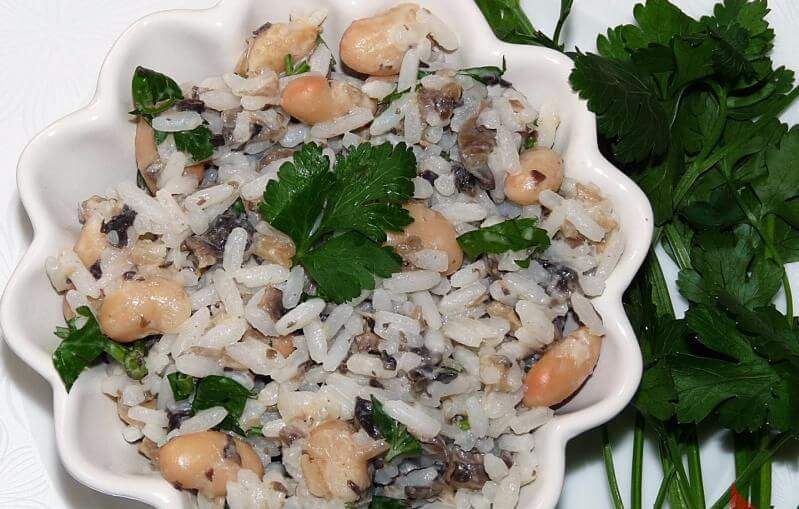 Предлагаем удачный рецепт для приготовления аппетитного салата с рисом, грибами и белой фасолью. Подготовка ингредиентов не займет много времени, с ней справится даже начинающая хозяйка. Салат вкусный в горячем и холодном виде. Его можно подать к холодной мясной нарезке или как самостоятельный ужин.