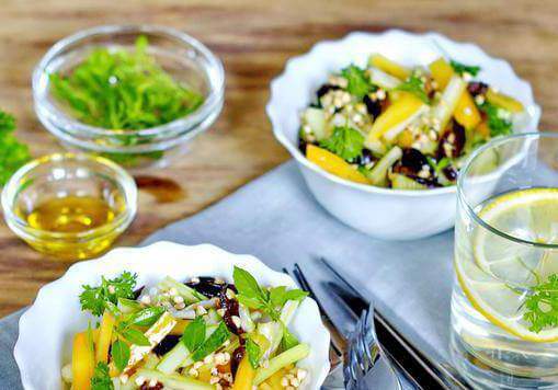 5. Высыпьте в салатное блюдо сельдерей, перец, огурец, чернослив и гречку посолите по вкусу и перемешайте. Затем посыпьте салат зеленью и полейте оливковым маслом. Салат с зеленой гречкой и овощами готов к употреблению.