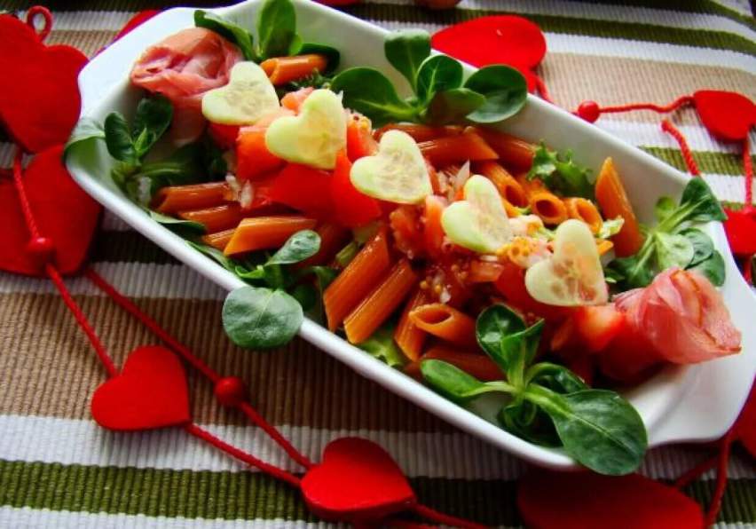 Макаронный салат ко дню влюбленных предлагаем приготовить из томатных макаронных изделий типа перья. Отлично дополнит основной ингредиент салат полевой (рапунцель) и пикантный соус с добавлением лука и ломтиков помидоров. В качестве украшения на блюде предлагаем выложить розочки из карпаччо (или тонких пластинок ветчины). А также сердечки, вырезанные из ломтиков огурца.
