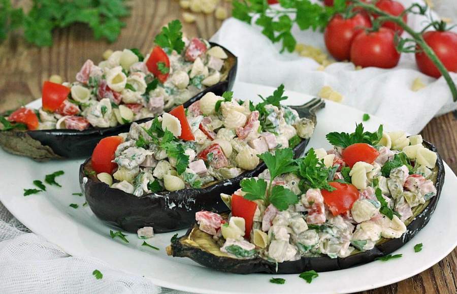 7. Салат из макарон с ветчиной и овощами в баклажанах готов. Он не только вкусный, но и красивый настолько, что появляется желание съесть его глазами.