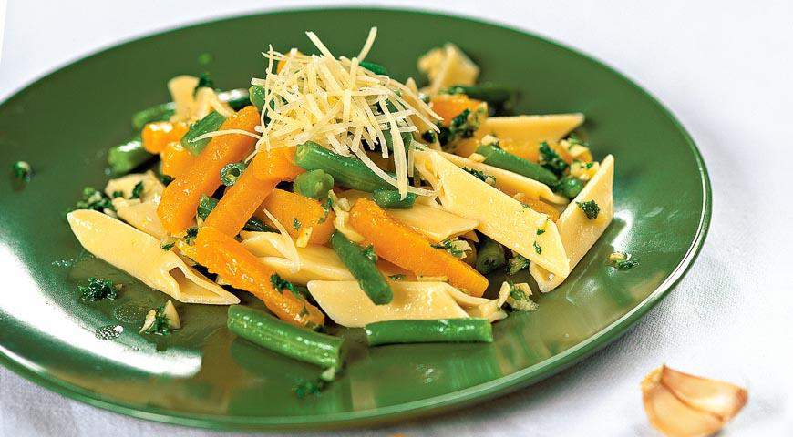7. Перемешайте макароны с тыквой, фасолью и чесночной заправкой в одной посуде, посолите и поперчите по своему усмотрению. Натрите на терке сыр и посыпьте ваш салат сверху оставшимися крупными кусочками петрушки и тертым сыром. Салат с макаронами и тыквой готов.