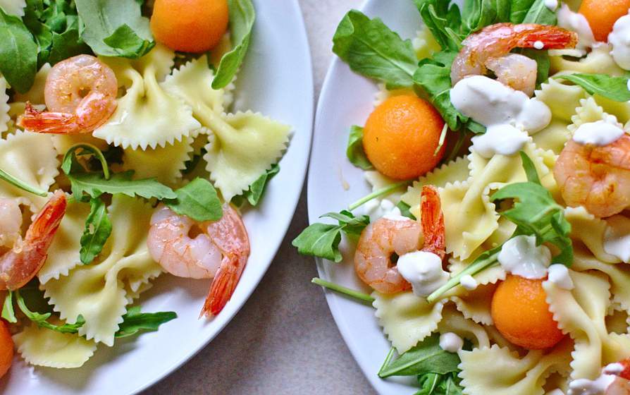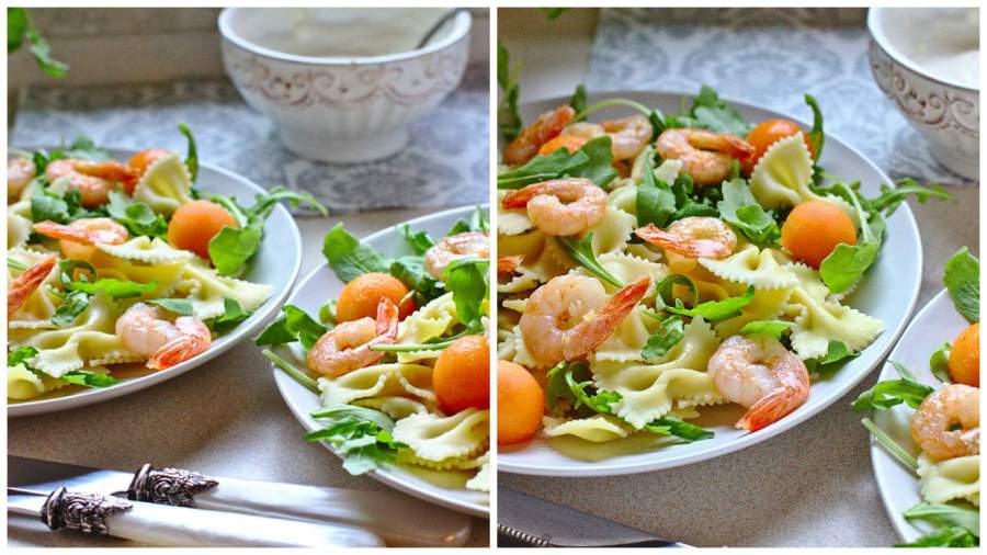 Готовим салат с макаронами, креветками и дыней