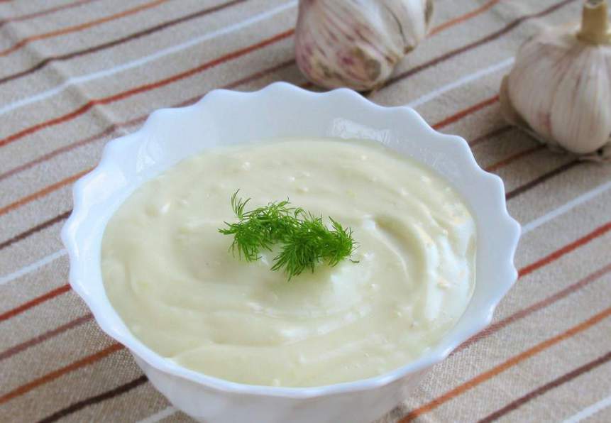 Для приготовления чесночного соуса используйте майонез собственного производства, сметану пониженной жирности или натуральный йогурт.