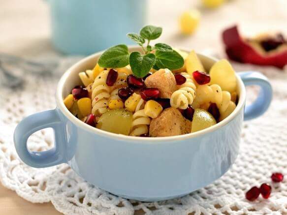 6. В глубокую миску переложите отваренные макароны, обжаренное куриное филе, кукурузу, виноград и зерна граната. Добавьте майонез и все тщательно перемешайте. При желании приправьте солью и перцем.